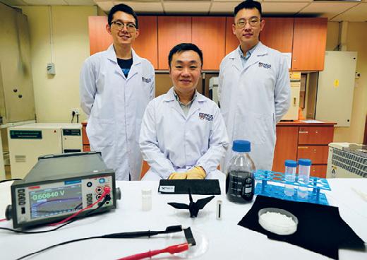Asst Prof Tan Swee Ching (Science ’01) (centre), together with Dr Zhang Yaoxin (Engineering ’20) (left) and Mr Qu Hao (right), developed a self-charging fabric that generates electricity from air moisture.