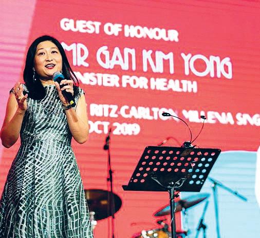 Above: Ms Foo chatting with a senior at the MWS Active Ageing Centre at Kebun Baru. Right: On stage at the MWS Charity Ball in October 2019.