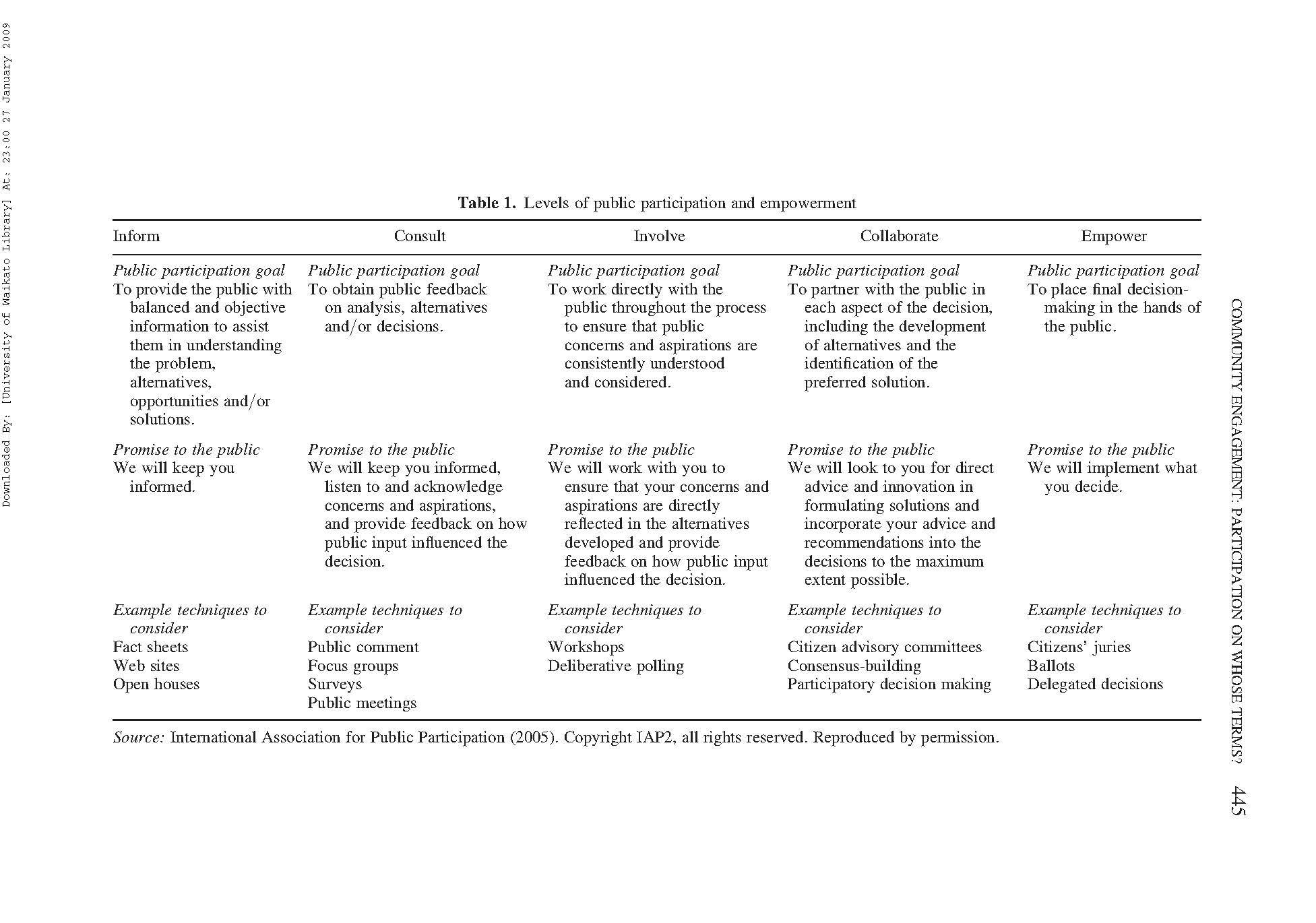 Head, B. W. (2007) Community Engagement: Participation on Whose Terms? Australian Journal of Political Science, 42(3), 441–54. https://doi.org/10.1080/10361140701513570.