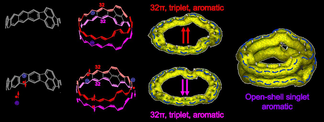 Theoretical studies suggest that the dication adopts a structure consisting of two weakly coupled [32]annulenes with Baird-type aromaticity along its edges. As charge separation plays a pivotal role in organic semiconducting devices, this insight offers a deeper understanding of the electronic delocalisation behaviour of CNBs in their charged states.