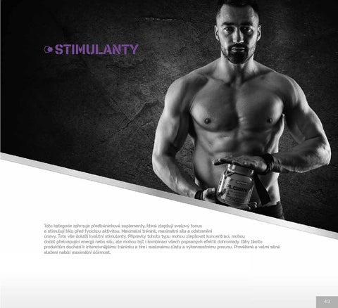 Tato kategorie zahrnuje předtréninkové suplementy, které zlepšují svalový tonus a stimulují tělo před fyzickou aktivitou. Maximální trénink, maximální síla a odstranění únavy. Toto vše dokáží kvalitní stimulanty. Přípravky tohoto typu mohou zlepšovat koncentraci, mohou dodat překvapující energii nebo sílu, ale mohou být i kombinací všech popsaných efektů dohromady. Díky těmto produktům dochází k intenzivnějšímu tréninku a tím i svalovému růstu a výkonnostnímu posunu. Prověřené a velmi silné složení nabízí maximální účinnost.