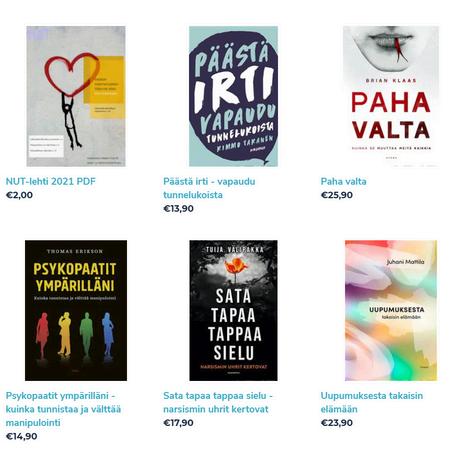 Narsisminuhrientukiry:nverkkokaupasta voitostaaNUT-lehtiäsekäkirjoja narsismistaainaedulliseenhintaan.Lehtiä onsaatavillasekäsähköisenäettäpaperisena versiona.Vanhemmistalehdistälöytyyaina ajattomianarsismiinliittyviäartikkeleita sekäomaankokemukseenperustuvia kertomuksia