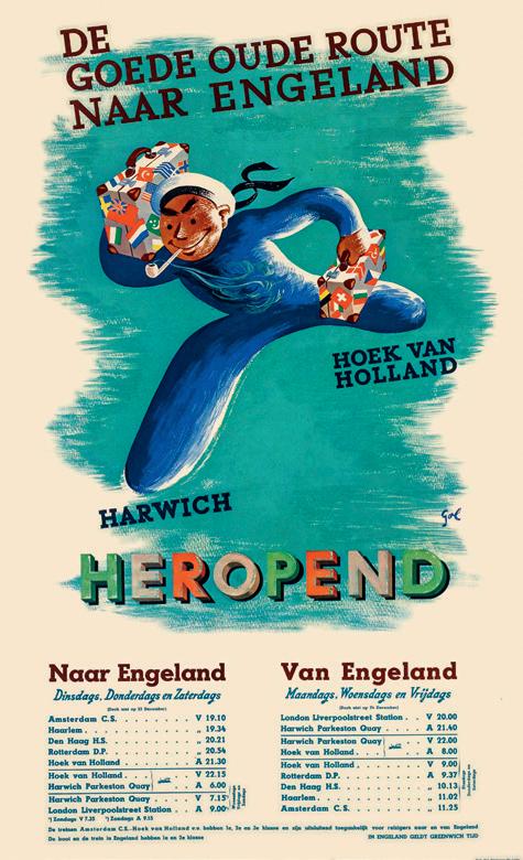 Een tweetal reclameposters voor treinen van en naar Hoek van Holland (verzameling Spoorwegmuseum). Links 1948, rechts 1958. Daarnaast twee koersborden. Het bovenste exemplaar dateert van 1949, het onderste is uit 1972. Collectie Het Utrechts Archief h