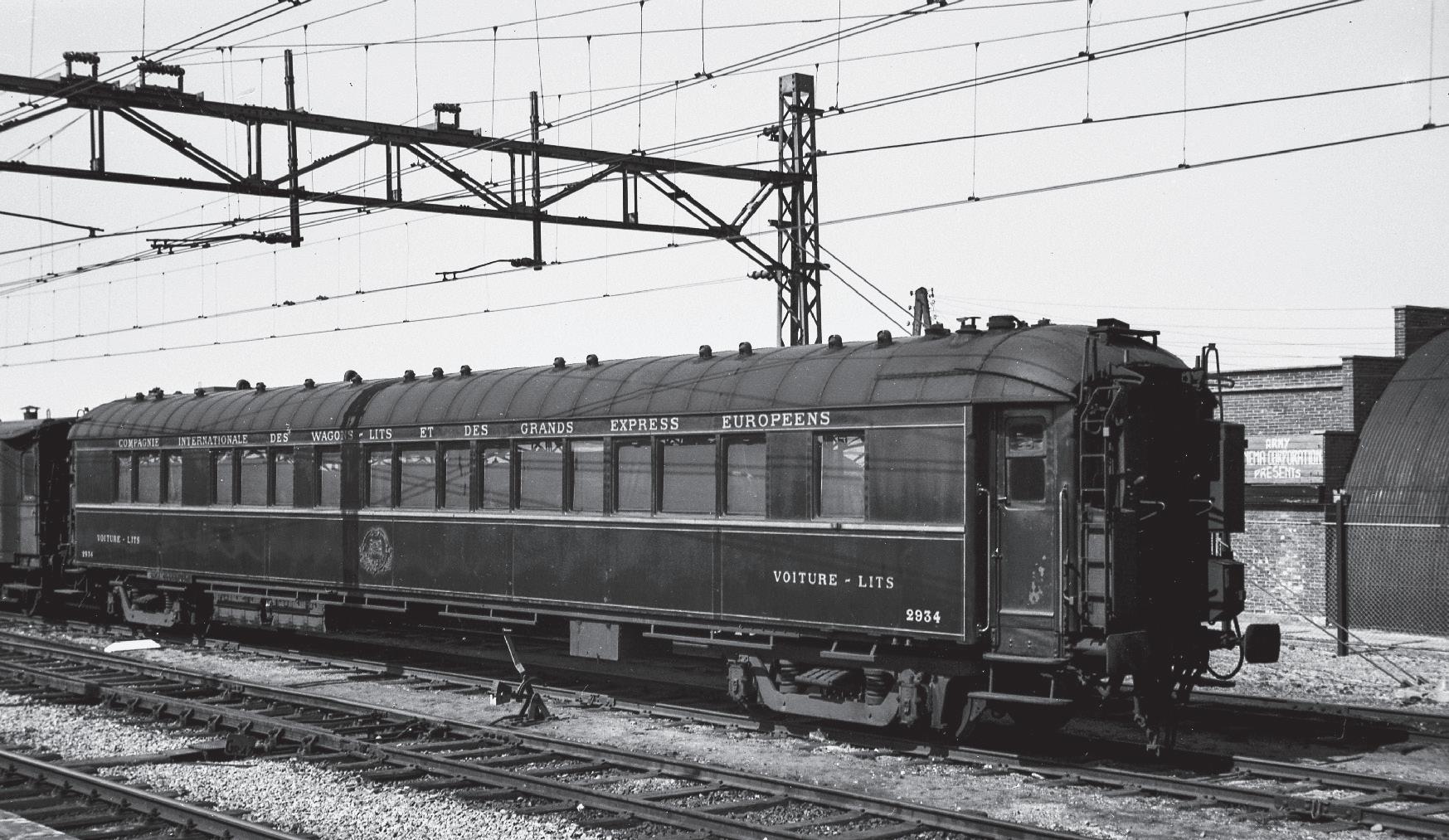 Slaaprijtuig CIWL 2934 op het rangeerterrein Hoek van Holland Haven. Op de achtergrond is de bioscoop van het doorgangskamp van het Britse leger te zien (zie ook plattegrond stationsemplacement).