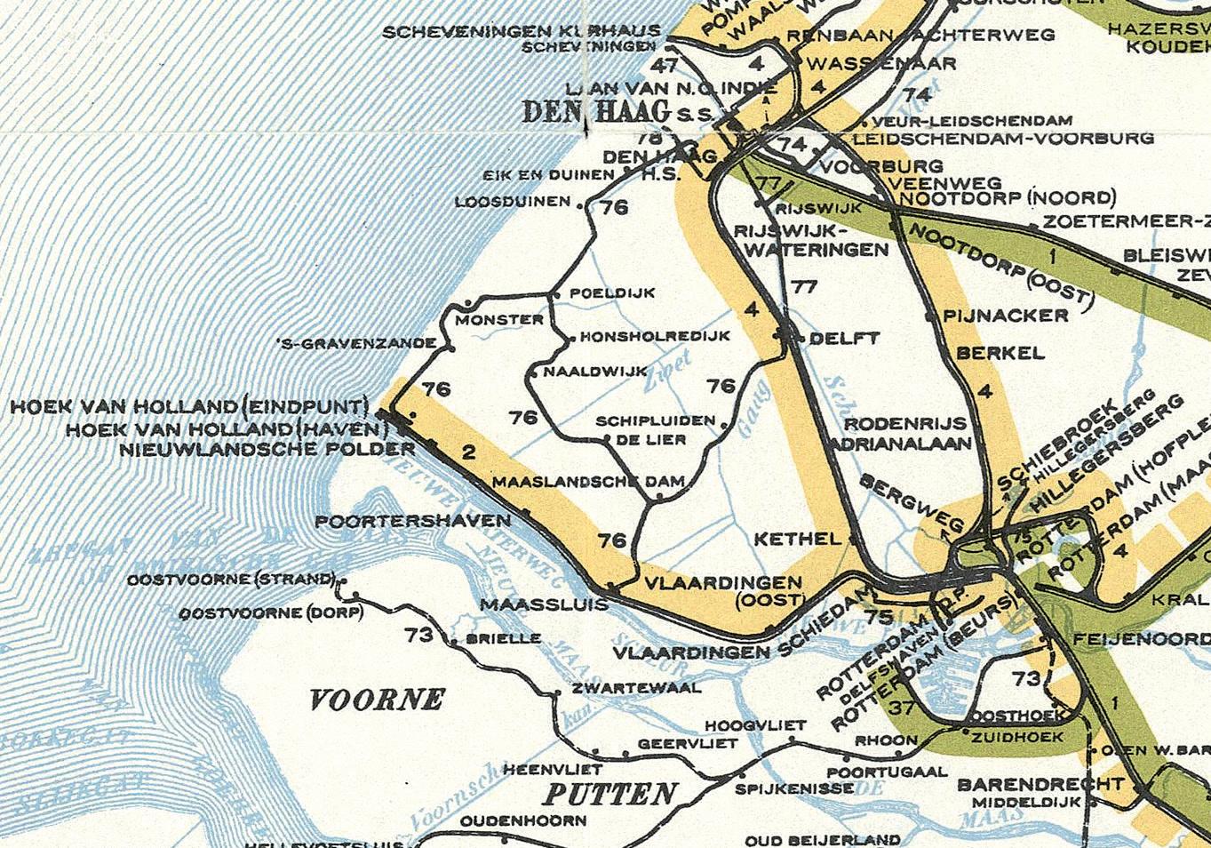 Een deel van de spoorwegkaart van Nederland uit 1931, waarop de locatie van station Hoek van Holland Haven duidelijk te zien is. Opvallend is ook de ligging van de lijnen in en rond Rotterdam. Pas in 1953 kwam een rechtstreekse verbindingslijn van Hoek van Holland Haven en van Rotterdam DP met de lijn naar Utrecht tot stand. Op de plaats van halte Hillegersberg verrees toen station Rotterdam Noord. Collectie Paul Hartman h