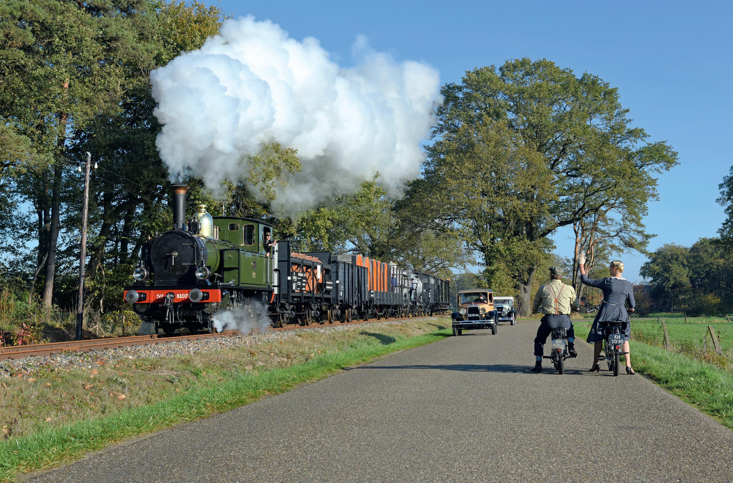 Figuranten in gepaste kledij dragen veel bij aan het welslagen van evenementen bij museumbedrijven. Boven: terwijl locomotief 8107 van de Museum Buurtspoorweg met een goederentrein onderweg is, passeert een scala aan oude voertuigen bij Boekelo op 5 november 2022. Onder: figuranten in Hoorn die met de Museumstoomtram meereisden tijdens het Roaring Twenties Bello festival op 29 oktober 2023. h Arno Verhagen, Jeroen Doedel