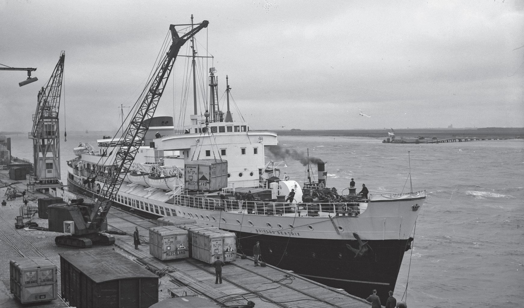 Zicht op een schip aan de kade (Stationsweg) voor de SZM-veerboten naar Harwich, met links de oude en nieuwe stationsgebouwen van Hoek van Holland Haven en rechts de Nieuwe Waterweg.