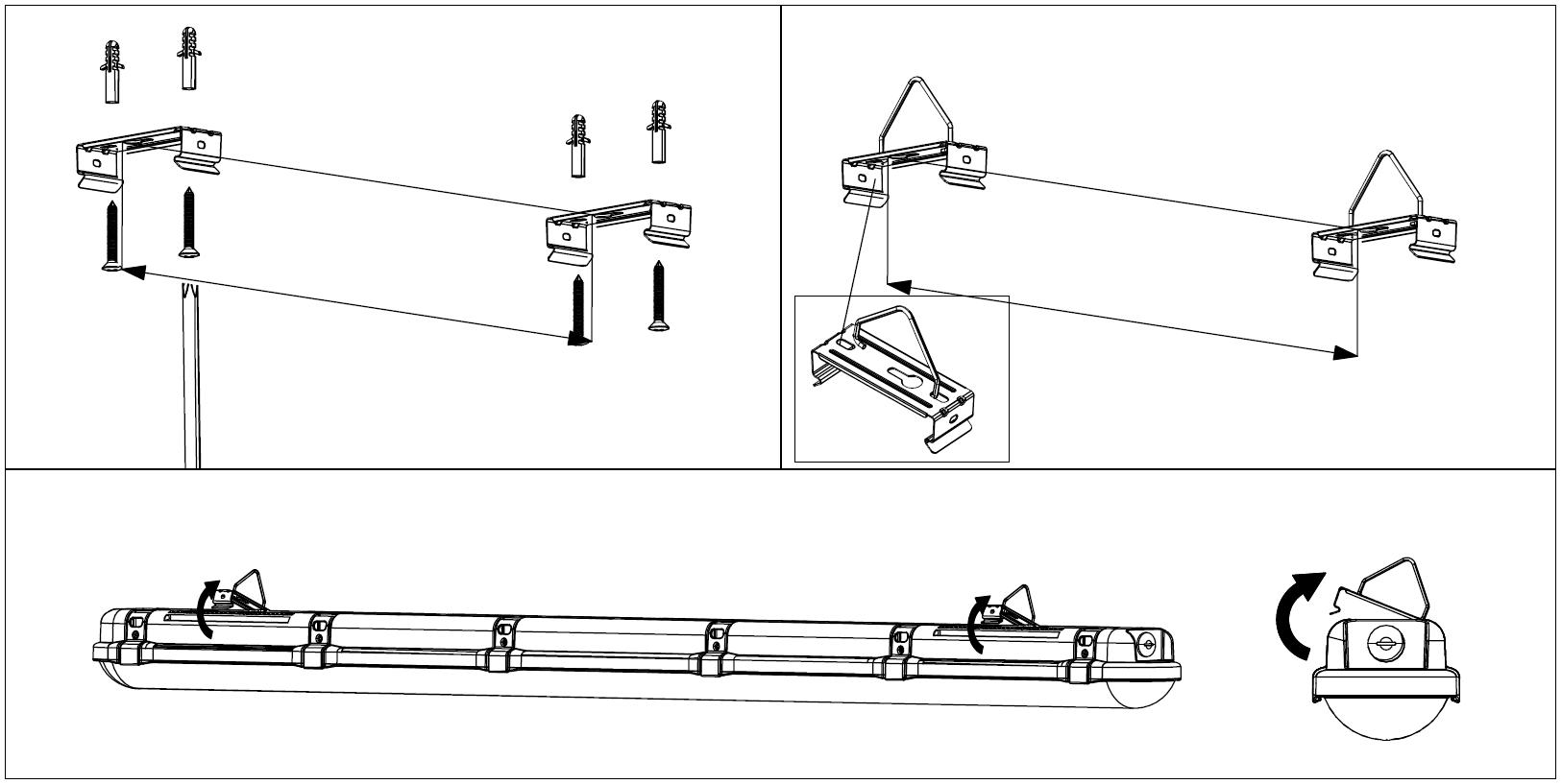 Chain or Wire suspension: Mount the two stainless steel surface mount fixing clips to the base. Then add a V hook (provided in the accessory pack) to each of the surface mount clips. This will provide connection points for chain or wire suspension at the specified fixing centres (see diagram)