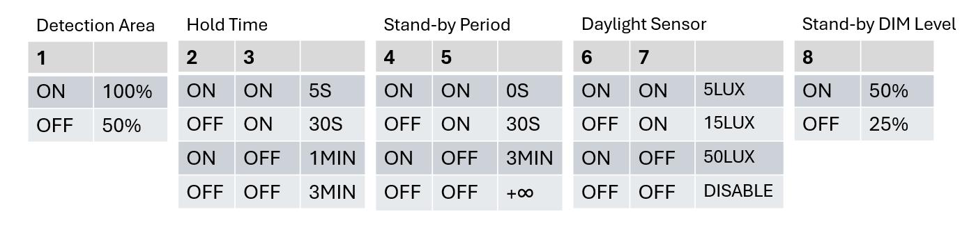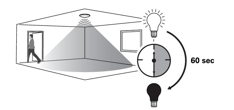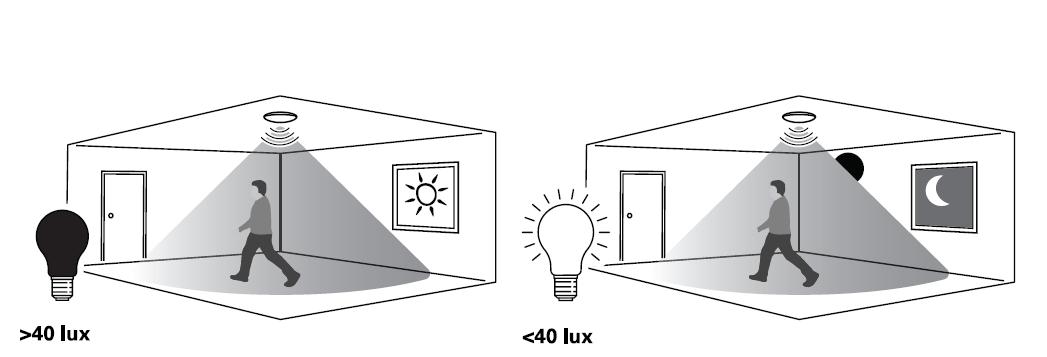 Default setting: 5s Can be set: 30s / 1 min / 3 min >50 lux <50 lux