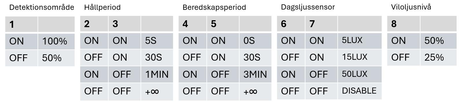 Detekteringsområde Hålltid Standbyperiod Dagsljussensor Grundljus