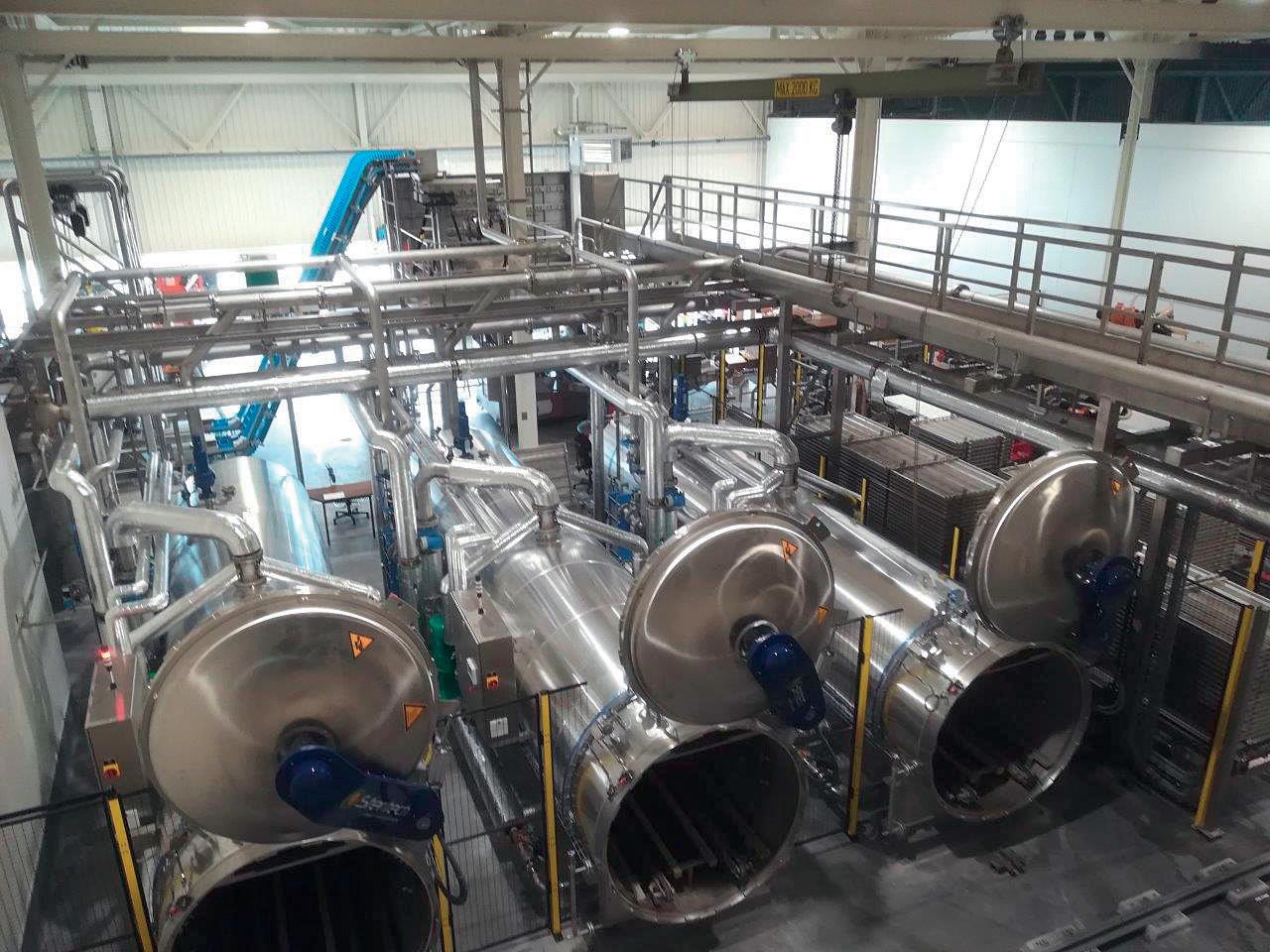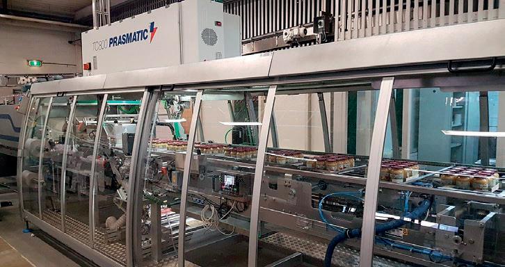 aan de beurt die de zakken oppakt, stapelt en transporteert naar de autoclaaf voor de sterilisatie of pasteurisatie. Via een transportband gaat het dan naar een inpaklijn waar de zakken in een doos gaan en op een pallet. Het hele proces is volledig geautomatiseerd. Het oppakken van de zakken en ze netjes in de dozen zetten, was een hele puzzel, vertelt Van Leeuwen. “Soep is vloeibaar en dat zakt snel naar onderen waardoor de zak blijft staan. Met peulvruchten gaat dat niet zo snel”.