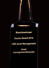 De jury van het Nationale Business Succes Award instituut heeft CMS Asset Management uitgeroepen tot winnaar in de Asset Managementbranche. “CMS is een zeer hoogwaardig bedrijf dat een sterke positie heeft opgebouwd. Absoluut een specialist op het gebied van Asset Management, c.q. het optimaliseren van het rendement van de assets van haar opdrachtgevers. Gedrevenheid, passie, innovatief, durf en visie, plus een 100% focus op de klant, maken van CMS een absolute topper in haar wereld”, aldus de nominatiecommissie.