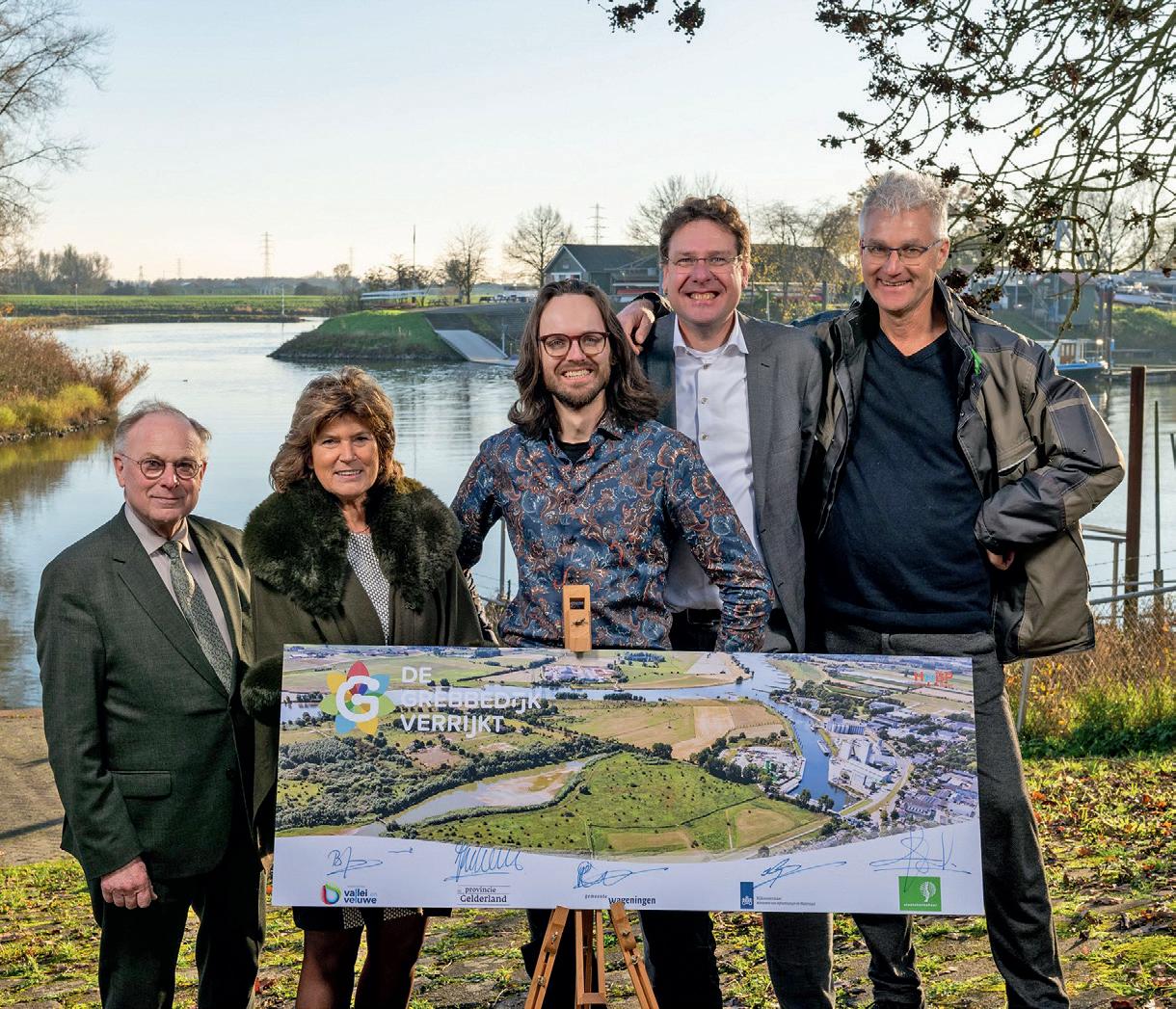 Van links naar rechts: Bert van Vreeswijk (heemraad, Waterschap Vallei en Veluwe), Ans Mol-van de Camp (gedeputeerde, provincie Gelderland), ErikJan Bijleveld (wethouder, gemeente Wageningen), Joost de Jong (ambtelijk opdrachtgever, Rijkswaterstaat), Arjan Snel (provinciehoofd Gelderland, Staatsbosbeheer).