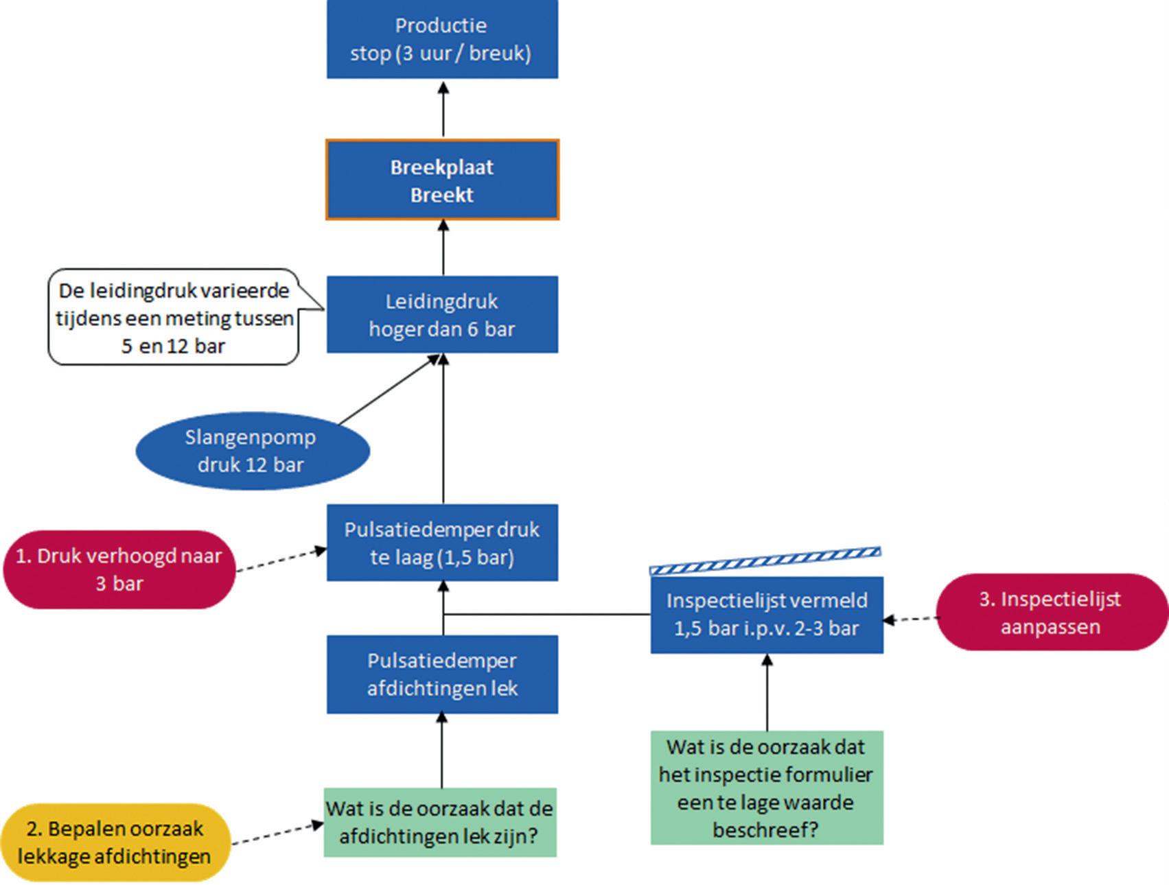Met een meting werd vastgesteld dat de leidingdruk varieerde, tot wel 12 bar. Veel meer dan de breekplaat kon hebben. Deze oorzaak was duidelijk: de druk was te hoog. Maar waardoor? De verdenking ging uit naar de pomp. Het was een slangenpomp met een pulsatiedemper en de leverancier werd uitgenodigd. Voor de leverancier was het snel duidelijk. De druk in de pulsatiedemper was te laag (1,5 bar) en daardoor sloeg de slang heen en weer. Door de druk te verhogen naar 3 bar werd de slang in toom gehouden en bleef de druk voor de breekplaat tussen de 4 en 5 bar. Precies hoe het ontworpen was.