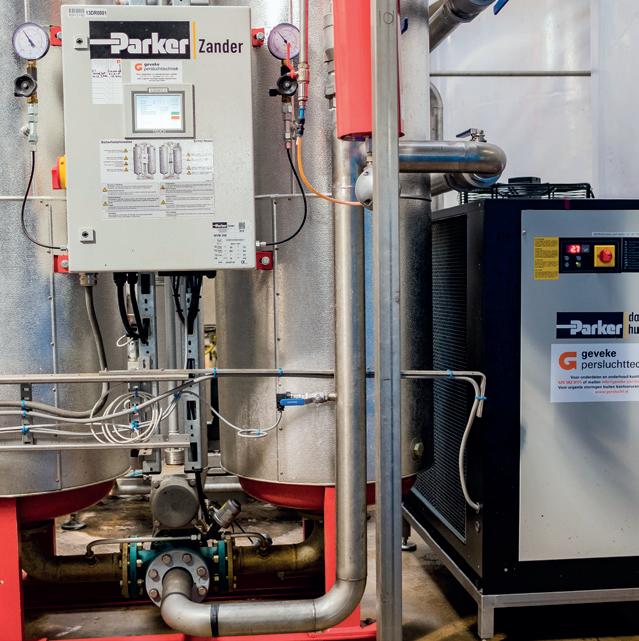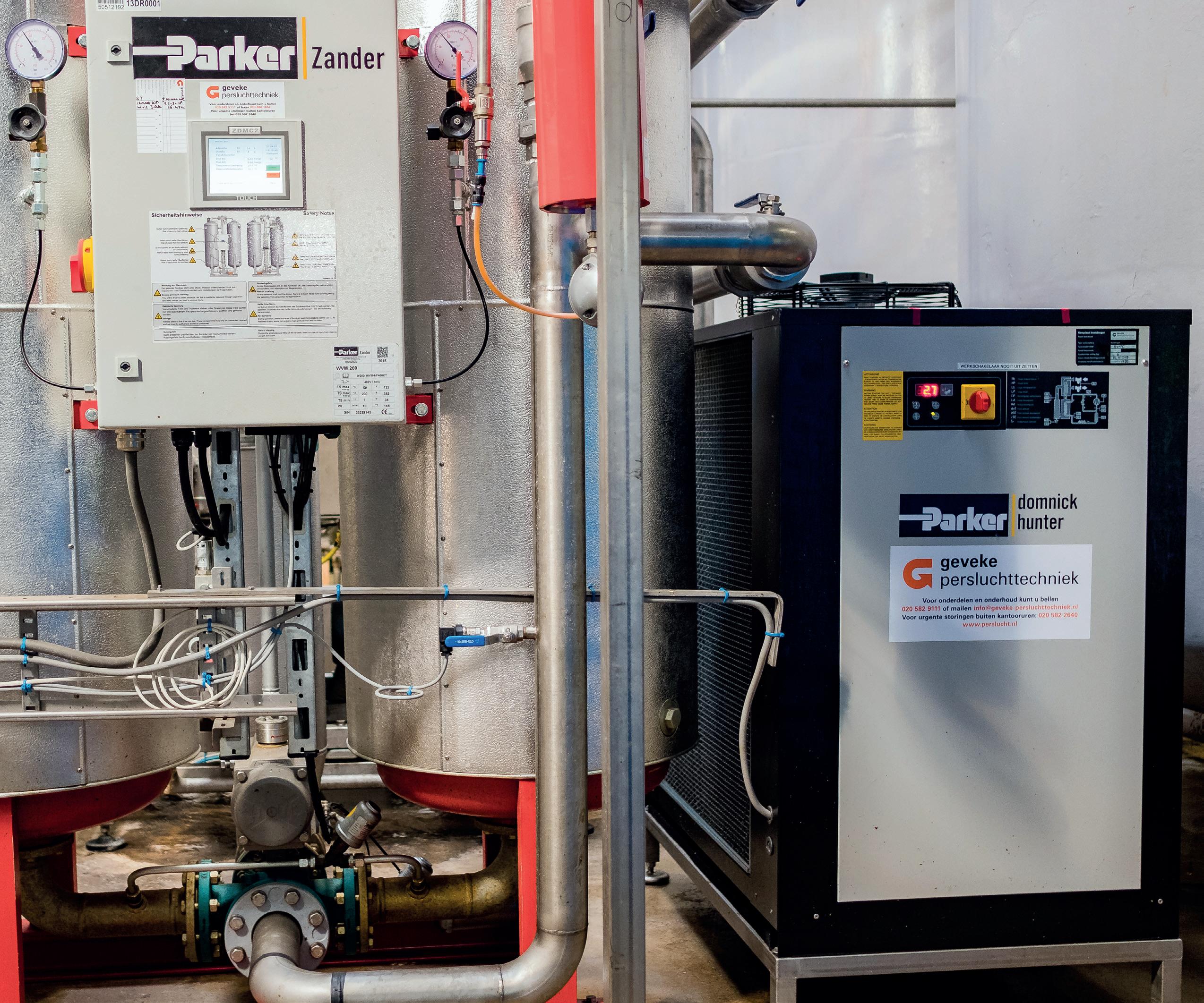 > Dauwpunt omlaag. PepsiCo heeft te maken met de wet- en regelgeving op het gebied van voedselveiligheid. De compressoren zijn daarom olievrij. En om vocht in appendages en het product te voorkomen, moet het dauwpunt zo laag mogelijk zijn. Bij de aanschaf van de nieuwe compressor werd het dauwpunt daarvoor verlaagd naar -55 graden Celsius. In overleg met leverancier Geveke is ervoor gekozen om de perslucht eerst te drogen met een koeldroger en daarna pas met een adsorptiedroger. “Lucht uit een compressor bevat dertig gram vocht per kuub, uit een koeldroger slechts zes gram. De adsorptiedroger verbruikt tweederde minder energie door de koeldroger ervoor te zetten. Deze investering verdienen we in een jaar terug. Geveke heeft ons hier echt een stap verder geholpen”.