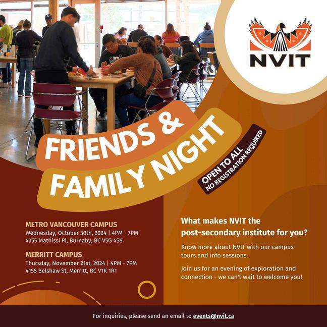 Please see page 5 to see upcoming events and workshop happening in both NVIT Merritt and Vancouver Campuses.