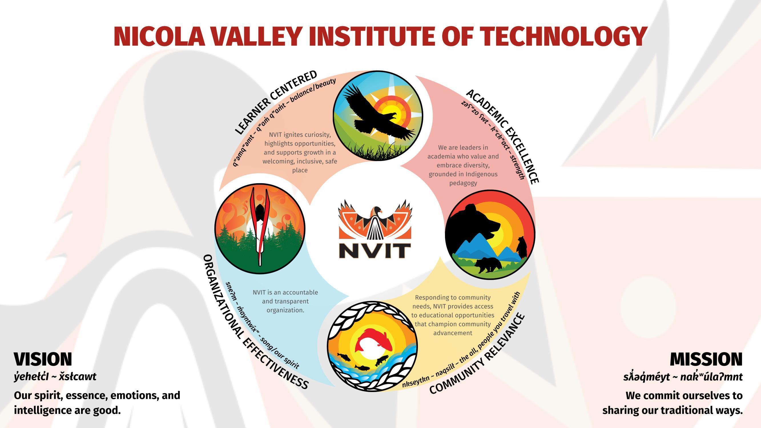 Nicola Valley Institute of Technology (NVIT) is located on the unceded lands of the Coast Salish, Nłeʔkepmx', and Sylix Peoples. Specifically, the shared territories of the Coldwater, Shackan, Nooaitch, Lower Nicola, and Upper Nicola First Nations - NVIT's 5 founding communities in 1983, as well as the Sḵwxwú7mesh (Squamish), Səlílwətaʔ (TsleilWaututh), and xwməθkwəy̓əm (Musqueam) First Nations.