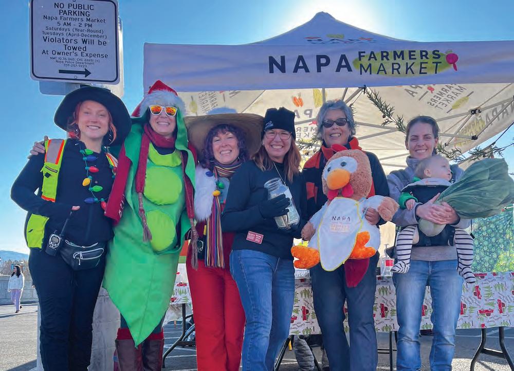 Mimi Adams, Bailie, Cara Mae Wooledge, Sandy Sauter, Holly Ong, Carine Hines and baby Loic at the Napa Farmers Market Give!Guide fundraising booth.