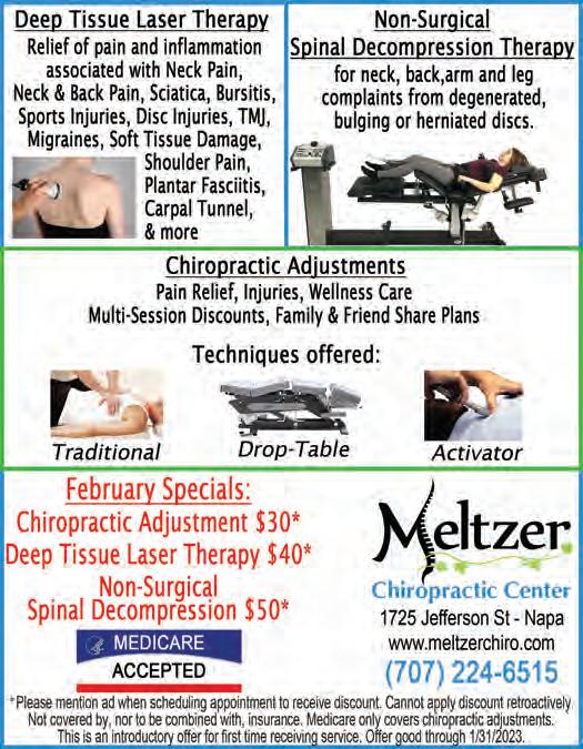 February 2023 napavalleymarketplace.com 31 New TUB or SHOWER SYSTEM in as Little as 1 Day! Long-lasting shower systems & acrylic tubs 866-438-2882 Our bathtubs and showers are perfect for accessibility and relieve safety concerns Our materials are made to combat against: Mold & Mildew • Water-Damage • Staining Cracking • Chipping • Peeling • Fading • Rusting CALL TODAY FOR A FREE NO OBLIGATION ESTIMATE SAVE $300 NO PAYMENTS AND NO INTEREST FOR A FULL YEAR OAC ADDITIONAL 10% OFF FOR A LIMITED TIME + AFTER BEFORE TheBathBiz.com Lic# 680993 Code YT AmeriCorps - National Service Serve in schools and non-pro ts. AmeriCorps members are a vital resource for our students and community. Visit napacoe.org/americorps for more information Make a Di erence! NCOE is recruiting and wants YOU Earn up to $10,000 in Education Awards Bene t Options: Health Insurance Child Care Student Loan Deferment CALL TODAY! (707) 346-2800 935 TRANCAS STREET, SUITE 2C, NAPA www.TreatYourLegs.com VARICOSE VEINS? LEG ULCERS? LEG PAIN? LEG SWELLING? LEG CRAMPS? LEG HEAVINESS? BURNING SENSATION? SKIN COLOR CHANGES? RESTLESS LEGS? Major Insurance, MediCal, Medicare, and Covered CA and Care Credit Accepted Se Habla Español VEIN SPECIALISTS: Jeffrey Brooks, MD Nelson Maldonado, MD