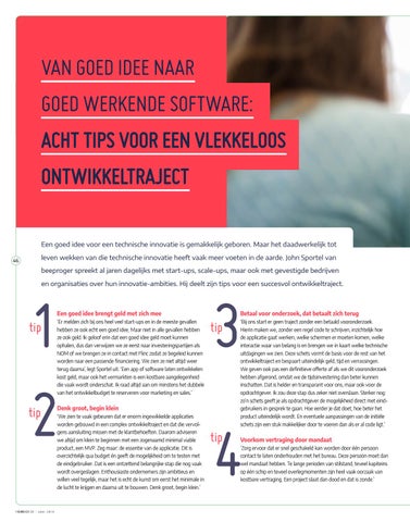 VAN GOED IDEE NAAR GOED WERKENDE SOFTWARE: ACHT TIPS VOOR EEN VLEKKELOOS ONTWIKKELTRAJECT Een goed idee voor een technische innovatie is gemakkelijk geboren. Maar het daadwerkelijk tot leven wekken van die technische innovatie heeft vaak meer voeten in de aarde. John Sportel van