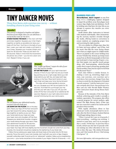 Barred for life Nevertheless, don’t expect an easy first foray. It is a challenging regimen designed to target the problem areas that plague most women: hips, thighs, butt and abdomen. You’ll be holding onto that barre for dear life as you attempt to squeeze tiny muscles you never knew you had. Small classes allow instructors to interact with students individually. After demonstrating the exercise, teachers circulate through the studio, offering hands-on corrections to ensure students are employing proper form and exercising the right muscles. “It’s very similar to a Pilates-type class, but it’s faster and more upbeat,” says O’Nan. And the music that fills the room during classes isn’t what you might expect in a ballet studio. There’s no pianist in the corner tickling away at some Tchaikovsky. Instead, up-tempo tunes pump from an iPod to keep people on their toes and motivated to keep moving. Expect a routine that targets very specific muscle groups along with heart-pumping, calorie-burning cardio. Don’t expect a bouncing, gyrating Jane Fonda aerobics class, but do expect to feel that oft-discussed “burn.” Each class follows a similar format, including a warm up, stretching, thigh exercises, seat exercises, core exercises and a cool-down, but exercises change from class to class to avoid the development of dreaded “muscle memory.” And the instructors’ resumés certainly don’t hurt. One performs in Le Rêve and one with Nevada Ballet Theatre; other instructors boast strong fitness backgrounds. Because of the intensity of the Pure Barre method, achieving quick results is actually a realistic expectation. The program also offers a special program for recent mothers, aptly named The Baby Bounce Back. O’Nan says one new mom lost a total of six inches and 30 pounds in three months. With regular attendance (three to four classes per week), most people start to see results after the first 10 classes. Student Patricia Ochal began taking classes in June. “When I turned 40, I put on 10 pounds. I tried everything — nothing was working. I started to come here, and I try to average 6 days a week,” Ochal says. In just less than a month, Ochal says she lost 10 pounds without making any other alteration to her routine or diet. She says, “My clothes fit loosely now, and I feel muscle all over. I feel strong. I feel great.” For more information, visit www.purebarre.com.