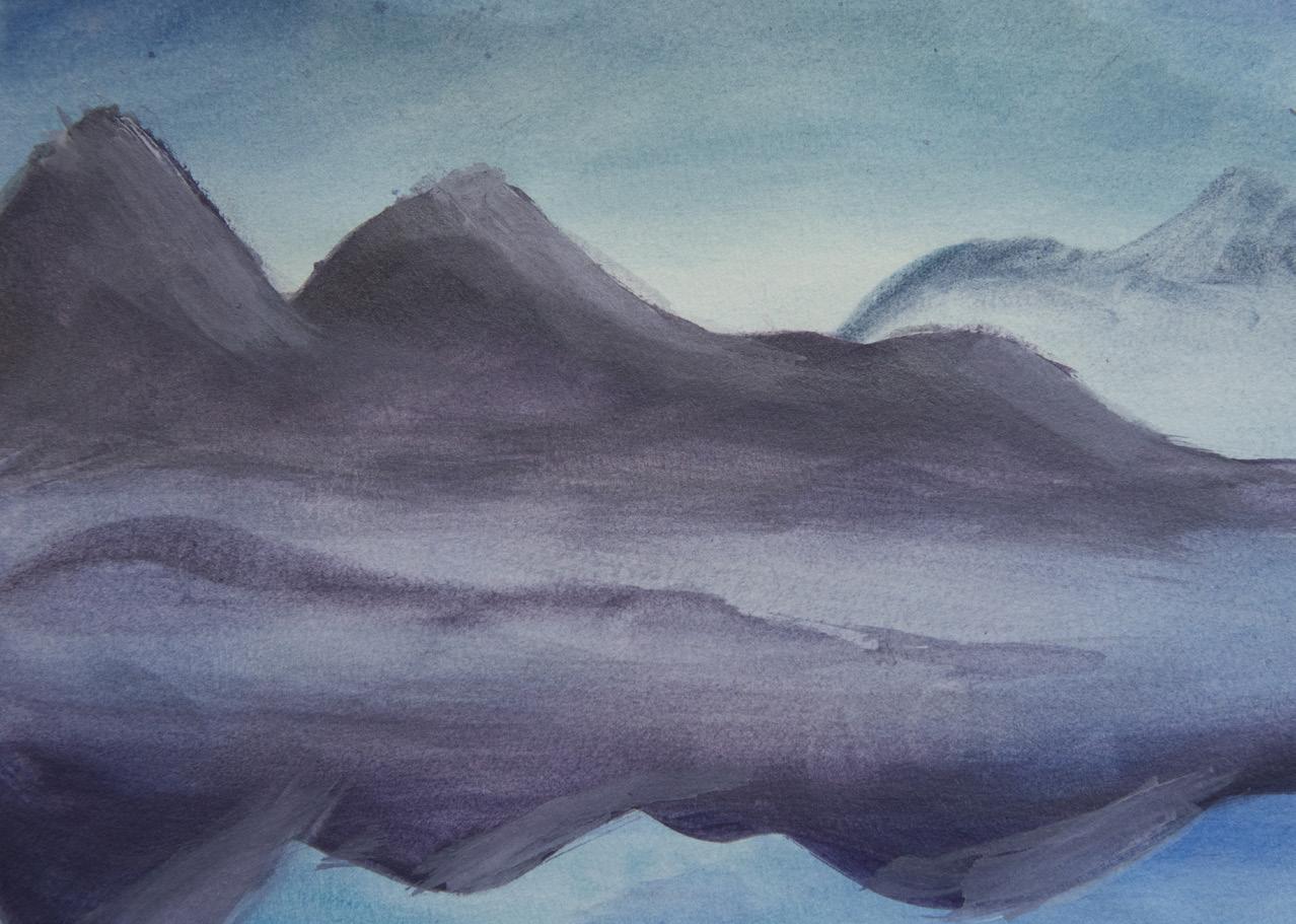 In watercolors, it can be hard to mimic the use of a palette knife. To create this effect, use a brush and blend downward as normal for the mountains. For the highlights, use white gouache paint with a dry brush, and it will work the same way.