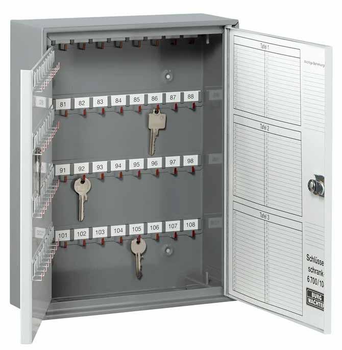 The BURG-WÄCHTER key cabinet 6700 is available in different versions. The largest key cabinet even offers space for 204 keys. The door of all models is hinged on the right. For optimum organisation, the key cabinet 6700 is equipped with afold-out inner panel. The models for 108 and 204 keys have two interior panels.