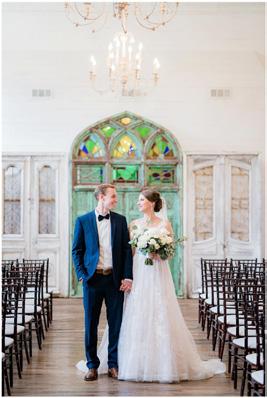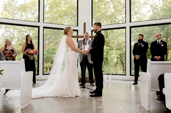 Despite the threat of rain, the couple’s wedding day unfolded beautifully. They made a last-minute decision to move the ceremony indoors to the chapel at their venue, Osage, which turned out to be a picturesque setting.