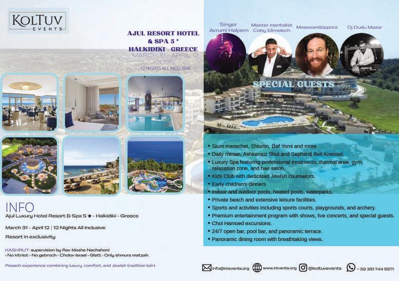 Club • Jungle Park • Guided excursions • Sports & recreational activities • Personal trainer • Shiourim Park Rav Moshe Cohen • DJ sets & Live performances by PURE SHOWBAND • Special appearance by the famous singer and Paytane Pinhas Cohen for a magical Mimouna