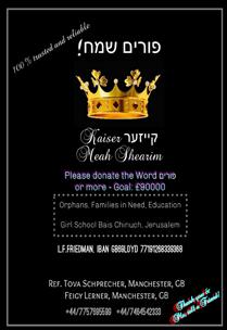 Happy Purim, B. Chontow D. Halibard Help distribute Matonos L'Evyonim on Purim day, bringing joy to needy families and cities all over Eretz Yisroel. 7200 Families In Need - 500 Shekel Each םינויבאל תונתמ ד״סב March 2022 Registered Charity No: 1115426 www.bezri.org • 07710 523 919 • ukoffice@bezri.org Purim 5783/2023 Bank Details: Account: Yad Eliezer Trust Sort Code: 20-29-41 Account Number: 53747212 Call 07710 523 919 for other payment options Achisomoch QR Code
