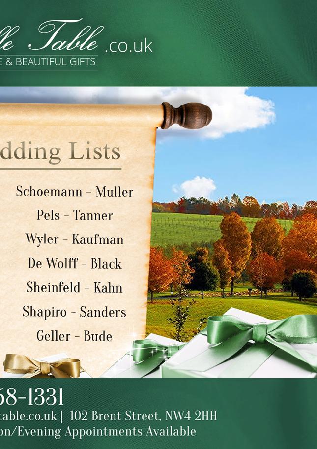 Please contact: O2O8 959 1137 gerry@millhillsynagogue.co.uk www.nerorre.co.uk This offer applies only to new direct bookings and is valid until 3O/11/23 for list price functions taking place until 3O/6/25 YOUR SIMCHA IN THE HEART OF NW LONDON www.northwestcircular.com 23