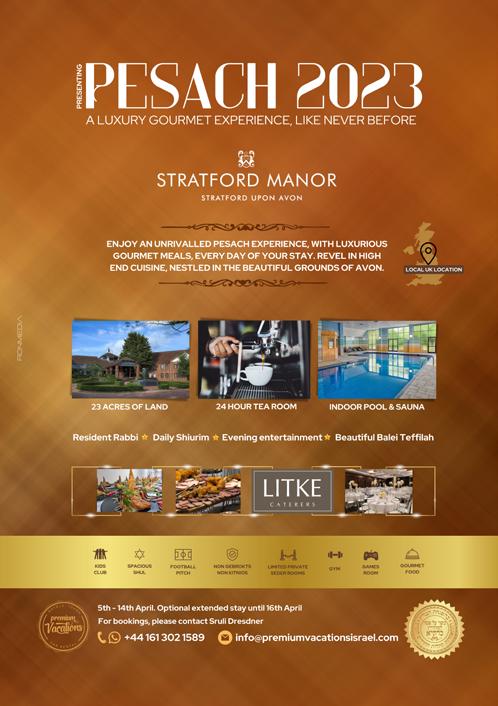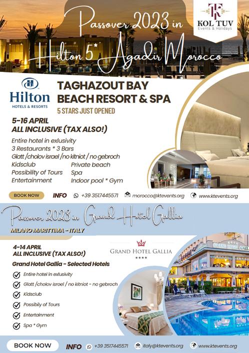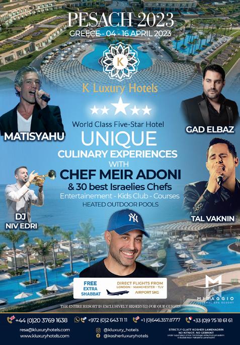 www.koshertravelers.com | info@koshertravelers.com ISRAEL: +972 2 992 9801 | USA/CANADA: +1 646 240 4118 | EUROPE: +44 207 048 6168 | AUSTRALIA: +61 39 9997496 LUXURY CRUISES | EXOTIC TOURS | SKI VACATION | AFRICAN SAFARI | SUKKOT HOTELS | ISRAEL TOURISM PESACH 2023 250 USD FREE VOUCHER FOR YOUR FLIGHTS TO RHODES LIMITED OFFER Kashrut is Glatt Mehadrin, under the strict supervision of Rabbi Berel Simpser. Non-Gebrochts www.ikmehadrin.com Avi Steinitz Arik Porat STARTING AT $3500PERSONPER Rav Doron Perez