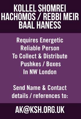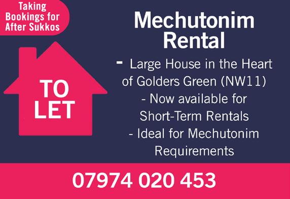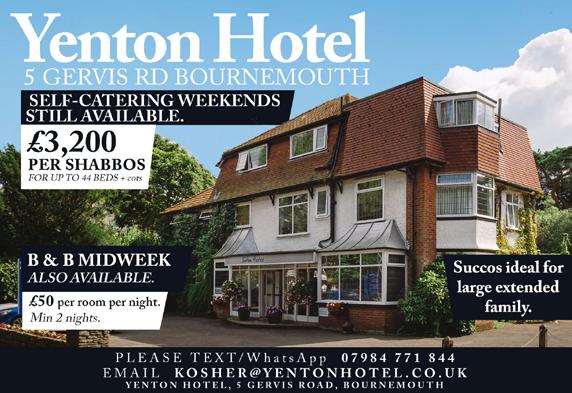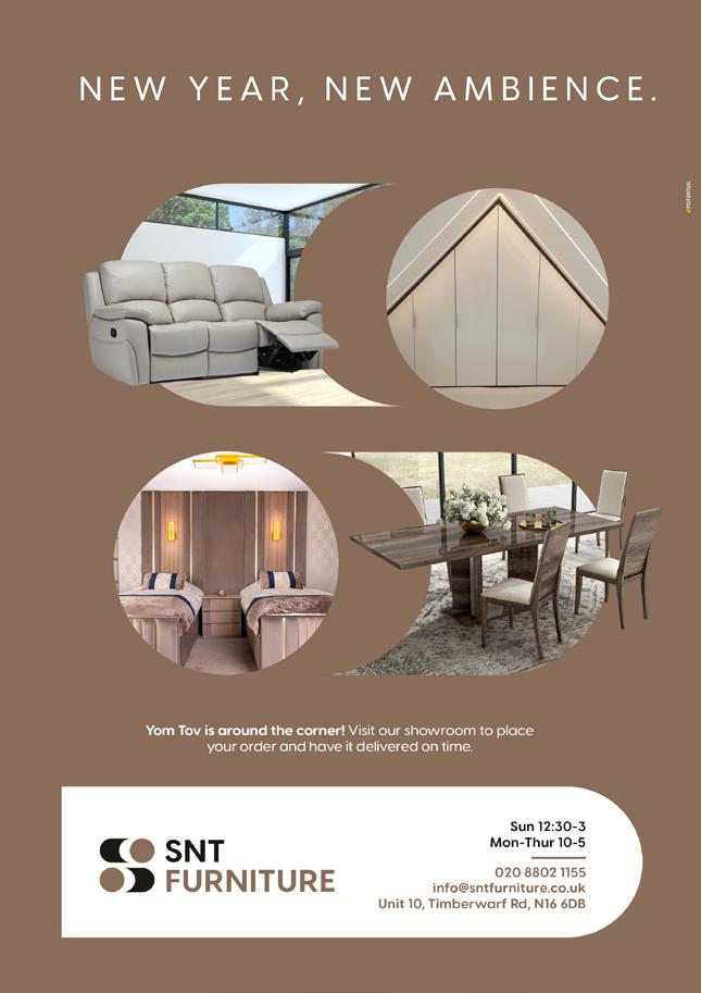 Please contact: O2O8 959 1137 gerry@millhillsynagogue.co.uk www.nerorre.co.uk This offer applies only to new direct bookings and is valid until 3O/11/23 for list price functions taking place until 3O/6/25 YOUR SIMCHA IN THE HEART OF NW LONDON • Beautifully presented • Fresh • Great service • Taste of home For all your Shabbos & Yom Tov meals or if you just want a break WEEKDAY SHABBOS YOM TOV SIMCHAS Enjoy hosting guests without the work of all the preparation! NOW TAKING RH / SUKKOS ORDERS CONTACT ALIZA cateringsomethingspecial@gmail.com www.catering.somethingspecialpresentations.com 0583 251 236 - IS +44 (0)208 150 33 34 - UK +1 646 693 8894 - USA Treat yourself to delicious, heimishe, quality homemade food Now under the kashrus of R' Dershowitz 12 SEASONAL CIrcular • 3rd SEPTEMBER 2023