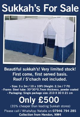 Hard-wall Super Deluxe Schach NEW C A L L : 0 2 0 3 - 0 1 1 - 0 3 3 8 O R D E R O N L I N E : W W W . S U K K A H M A R T . C O . U K GOLDERS GREEN FELSENSTEIN HALL 173 Golders Green Rd NW11 9BY 10am-6pm MANCHESTER see website for details www sukkahmart co uk STAMFORD HILL ADEN HALL 127 Clapton Common E5 9AB TEL: 020 3011 3117 12pm-8pm SAVE SAVE SAVE £75£75£75 LAUNCH DAY LAUNCH DAY LAUNCH DAY OFFER OFFER OFFER When you buy a sukkah or Rapid Roof get a free Sukkah light + free arba minim + free decorations Sunday 10/09 One DayOnly Arba Minim CRUSHED VELVET GEDOLIM PAINTINGSNEW