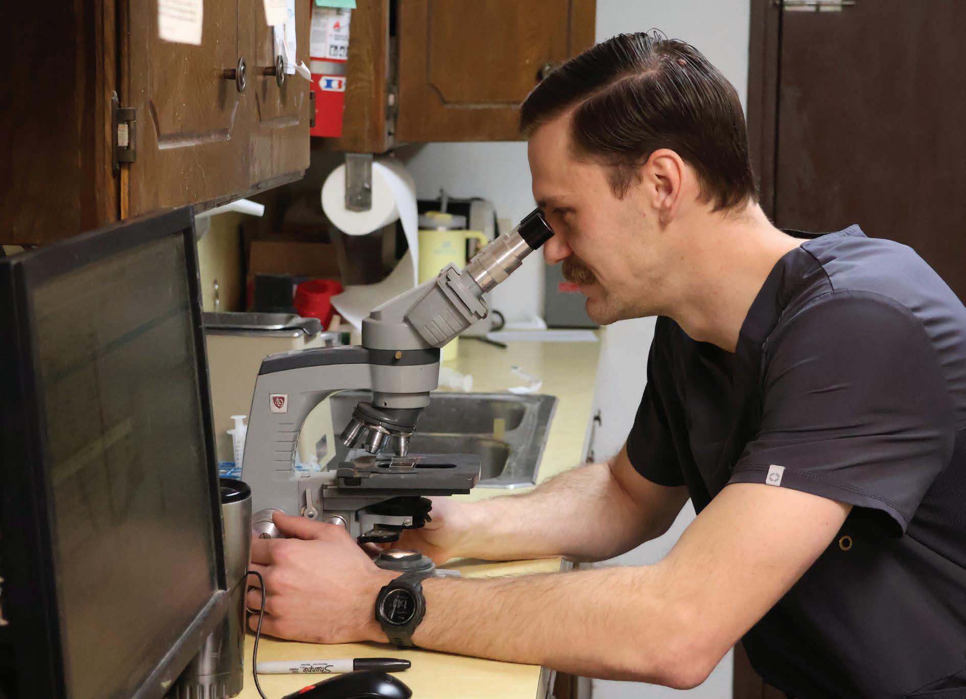 Dr. Hoffman at Ridgeview Veterinary Clinic studying through a microscope.