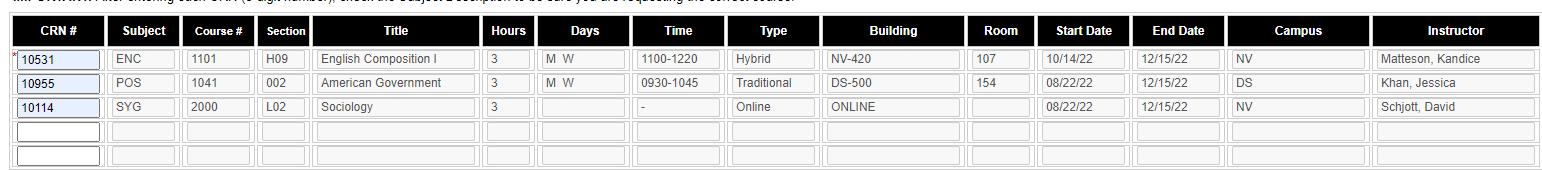 This section will provide accurate CRNs for classes the student may wish to drop from their schedule.