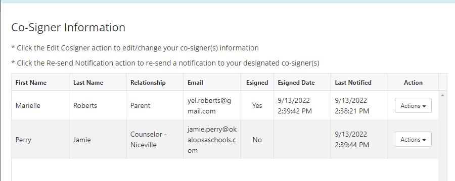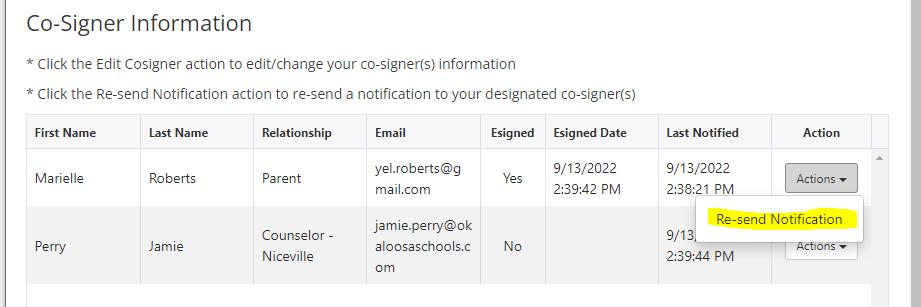 Students may send a co-signer a reminder by clicking Action, then Re-send Notification.