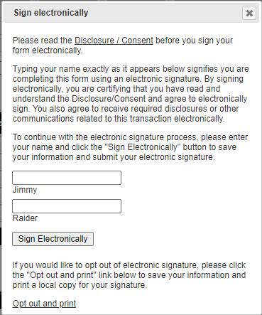 Student will read the disclosure/ consent and then type name exactly as seen in the Electronic Signature area.