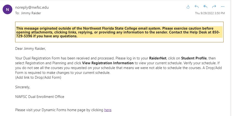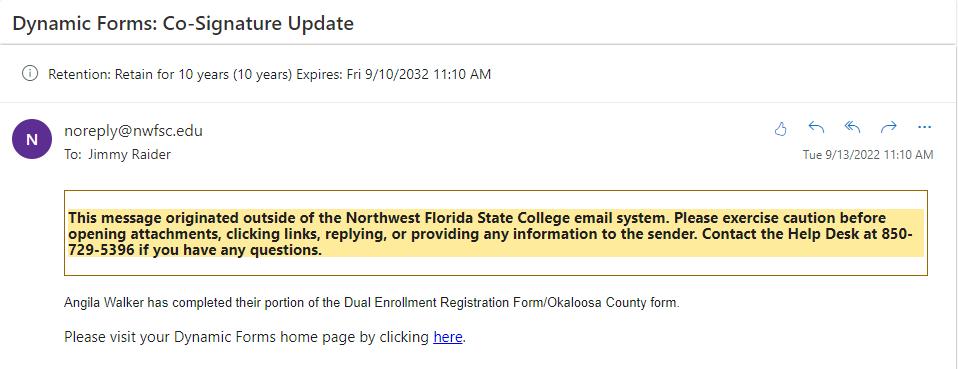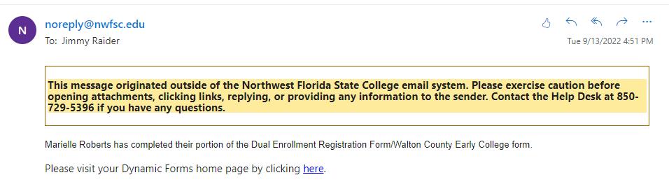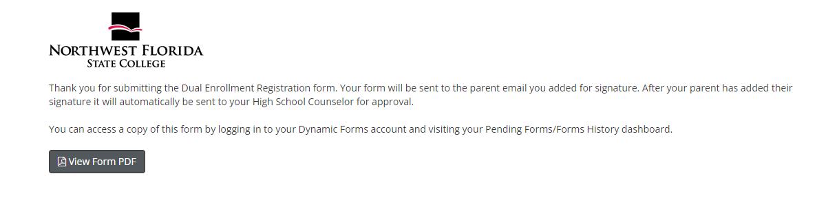 Student will receive an email in their NWFSC email inbox confirming the Counselor has completed their portion of the form. Their signature moves the form to the Dual Enrollment Dashboard for processing.