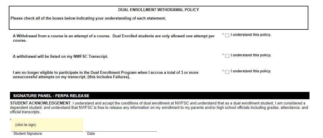 Students will be required to acknowledge understanding of the Withdrawal Policy and sign the FERPA Release.