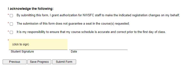 Students will click each statement in the acknowledgement section and then click to sign to enter the electronic signature. Students must click Submit Form to complete the process.