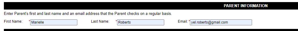 The student will need to enter the parent’s first and last name, and their email address. Students should enter an email the parent checks on a regular basis.