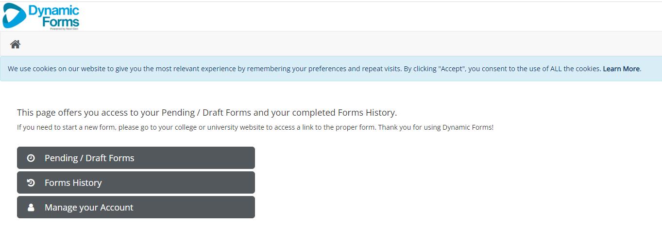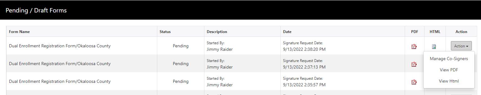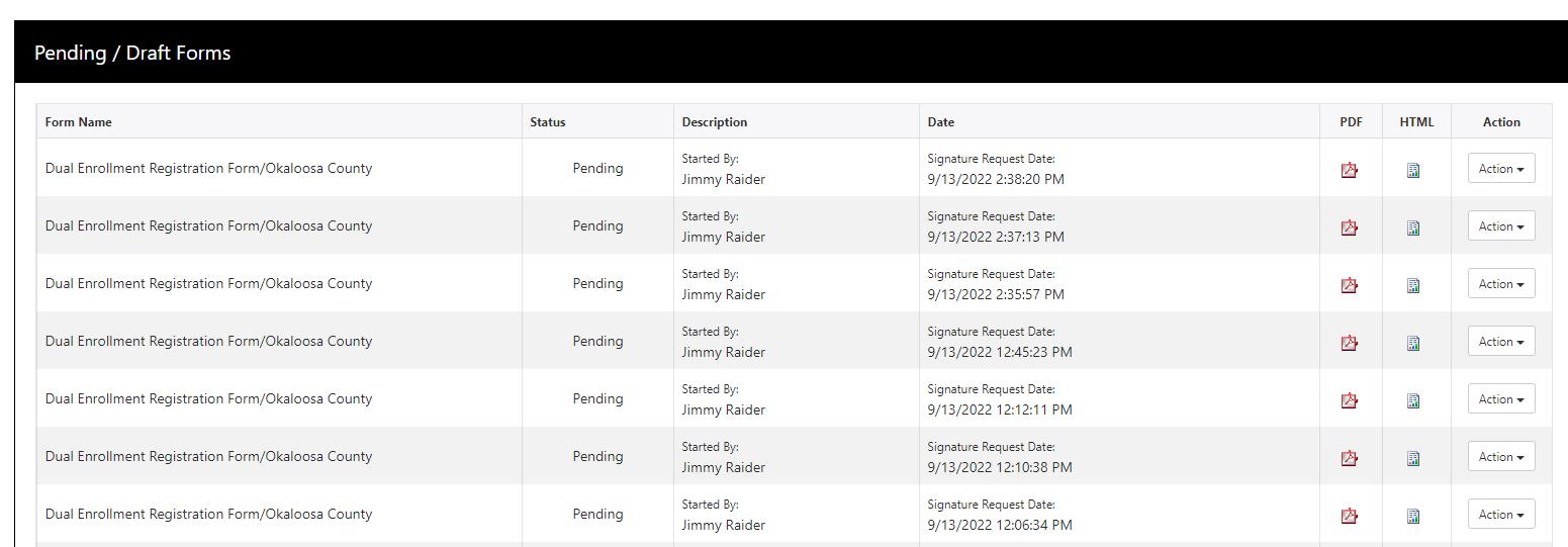 Pending/Draft forms are either waiting to be completed by the student or pending a signature of a co-signer.