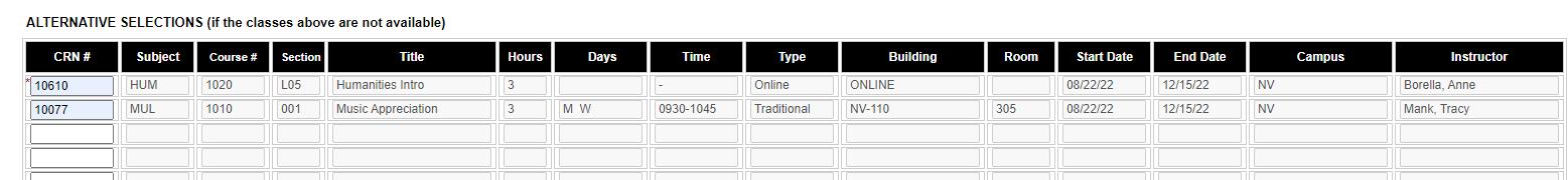 It is highly recommended that students take time to enter alternate classes that would fit their schedule in the event their first choice is not available.
