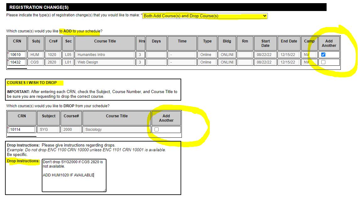 Students will enter CRNs for the classes they wish to add and drop. To add more than one class, place a check mark under ADD ANOTHER.