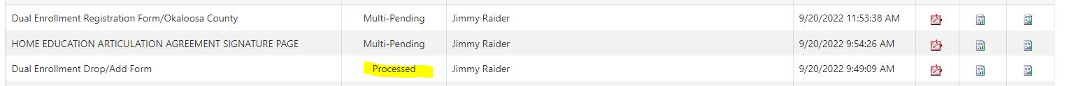 Pending Forms still need a signature; students can view the form by clicking the PDF icon.