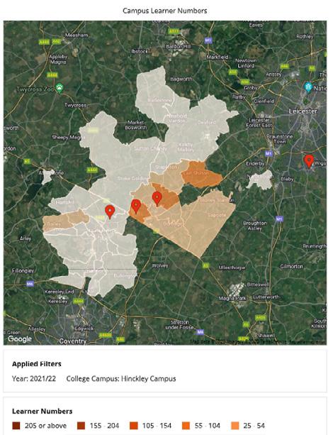 The Hinckley Campus is a specific creative industries-based facility offering courses from Level 1 to higher education, the map shows that the concentration of students who attend this campus travel from Earl Shilton, Barwell and Hinckley South.