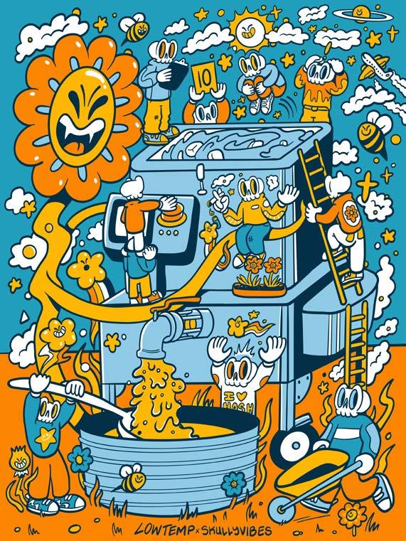 This encouragement led to Alex illustrating a series of nonfungible tokens called “Smoking Skulls” and tabling prints and stickers at Cannabis events. He eventually attracted the attention of multiple brands, beginning with Olio and its artist series of packaging.