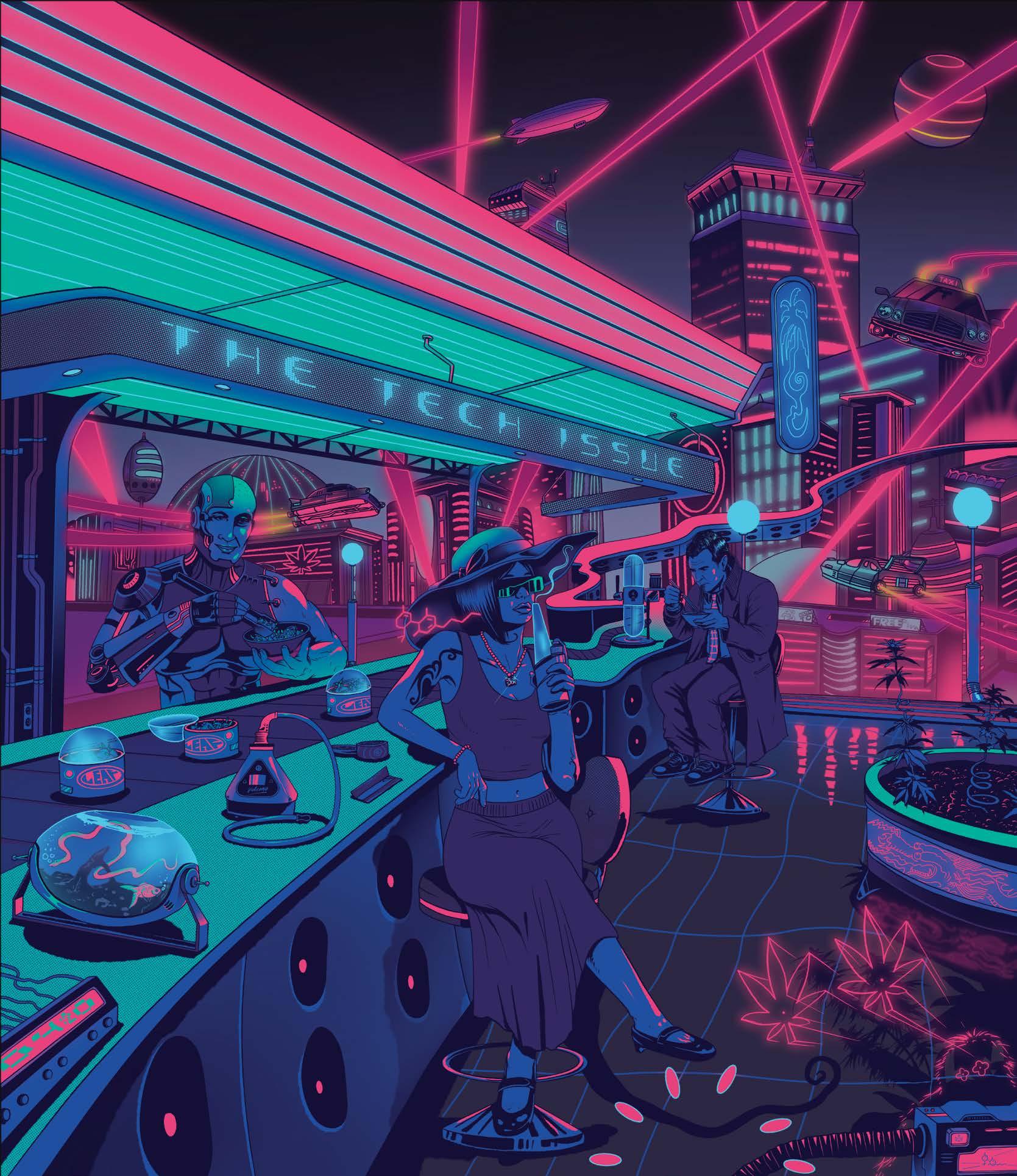 Leaf COO Tom Bowers created the concept of a dab bar set in a Blade Runner scene (cue the noodle slurp), and Ilham brought home the neon vision with abundant stoner details. For even more of his art, be sure to check out our profile in this month's Studio Sessions column from Leaf contributor Matt Jackson, pg. 38-39.