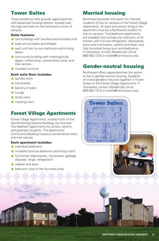 Gender-neutral housing Northwest offers upperclassmen the option to live in gender-neutral housing. Students of mixed genders may live together in Tower Suites or the Forest Village Apartments. If interested, contact Residential Life at 660.562.1214 or reslife@nwmissouri.edu.